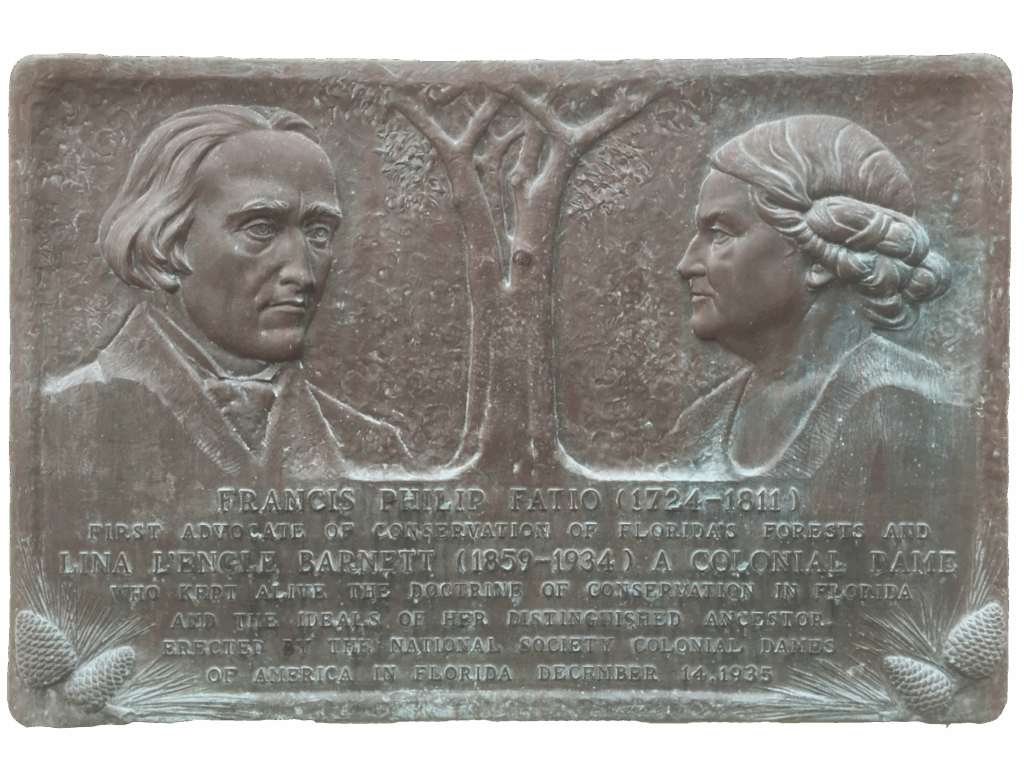 As a side note, if the surnames L’Engle and Fatio sound familiar, it is because they are steeped in Florida lore. Claudia and Lina’s ancestor Viscount Francis Philip Fatio, Sr., of Switzerland secured a British crown grant of 10,000 acres in the newly acquired East Florida colony and landed in St. Augustine in 1771. Lina especially followed in her great-great-grandfather’s footsteps to advocate for the conservation of Florida’s forests, warranting a special bench plaque commemorating them both. Presented in 1935 by the Colonial Dames, of which Lina was a member, to Rollins College in Winter Park, it also honored the friendship between Lina’s daughter Madeleine Camp and Alfred Jackson Hanna, the college’s history department chair.