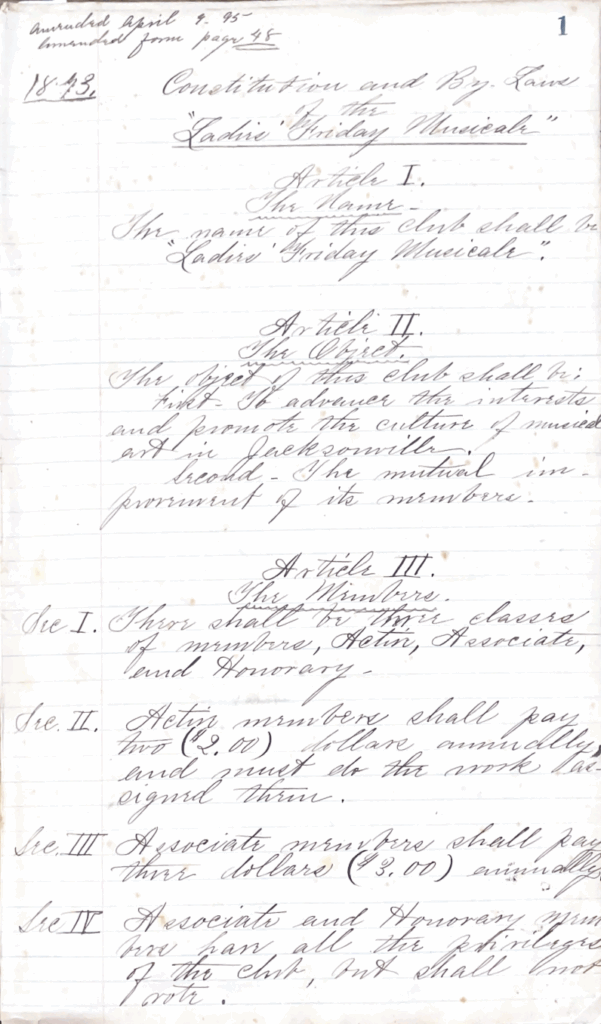 unexpected and early death of their founder in 1895, in a parlor room to decades of various leaders and locations and an arson devastation in 1995, the resilience of Friday Musicale is an allegory for the countless women who found power in society by taking up space in Jacksonville history through cultural development and for the transcendent quality of music as a conduit for creative self-expression for all.