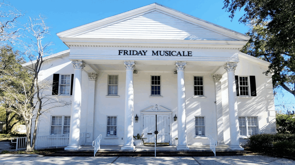 “Call it Jacksonville’s Musical Mecca… arguably the cornerstone of [our city’s] music scene,” Mark Faulkner declared in a 2000 Florida Times-Union article celebrating Friday Musicale’s nearly 80 years at 645 Oak Street. The organization, however, has roots as far back as 1890, meeting on Friday afternoons in the downtown home of founder Claudia L’Engle Adams at 37 Monroe Street prior to the Great Fire of 1901. From 12 charter members, who adeptly pivoted after the