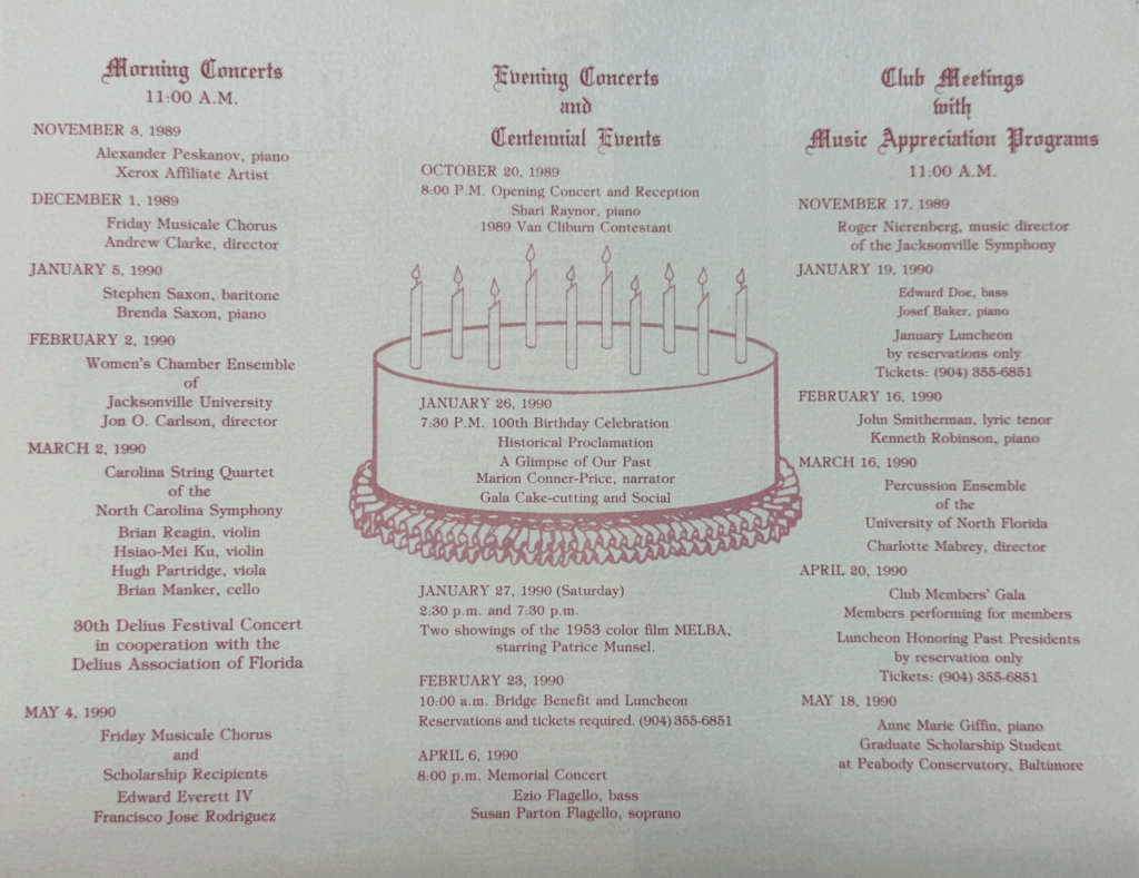 Friday Musicale 100th Birthday Celebration program, January 26, 1990, courtesy City of Jacksonville.