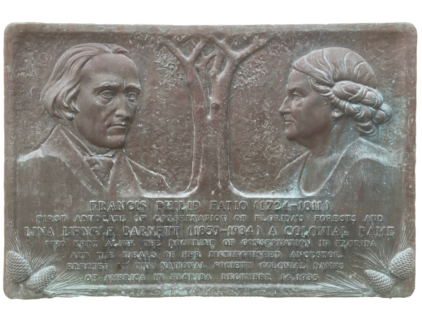 Bronze bench plaque honoring Francis Philip Fatio and Lina L’Engle Barnett, 1935, Rollins College.