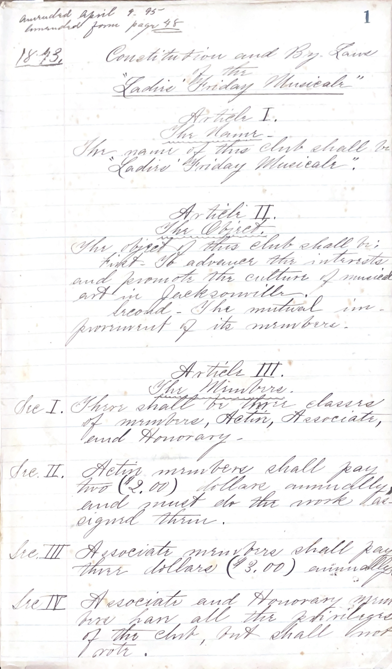 unexpected and early death of their founder in 1895, in a parlor room to decades of various leaders and locations and an arson devastation in 1995, the resilience of Friday Musicale is an allegory for the countless women who found power in society by taking up space in Jacksonville history through cultural development and for the transcendent quality of music as a conduit for creative self-expression for all.
