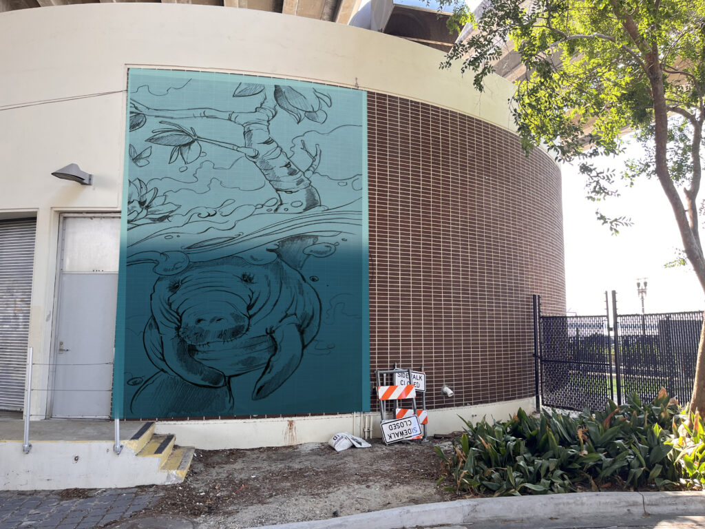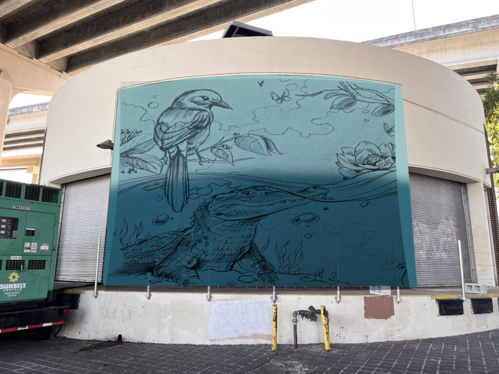 Maxcy’s design, which is themed around water, will be painted al fresco on the JEA pump station, an area approximately 17 feet tall by 90 feet wide. Maxcy’s original sketch mockup for the mural can be seen here. Hardbarger Painting will provide in-kind services to prepare the pump station surface before Maxcy begins his work.